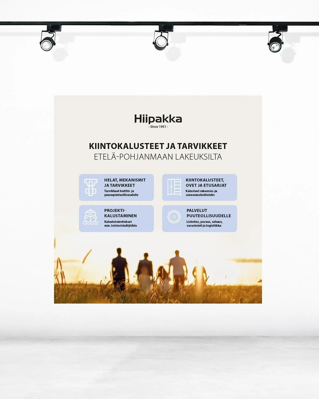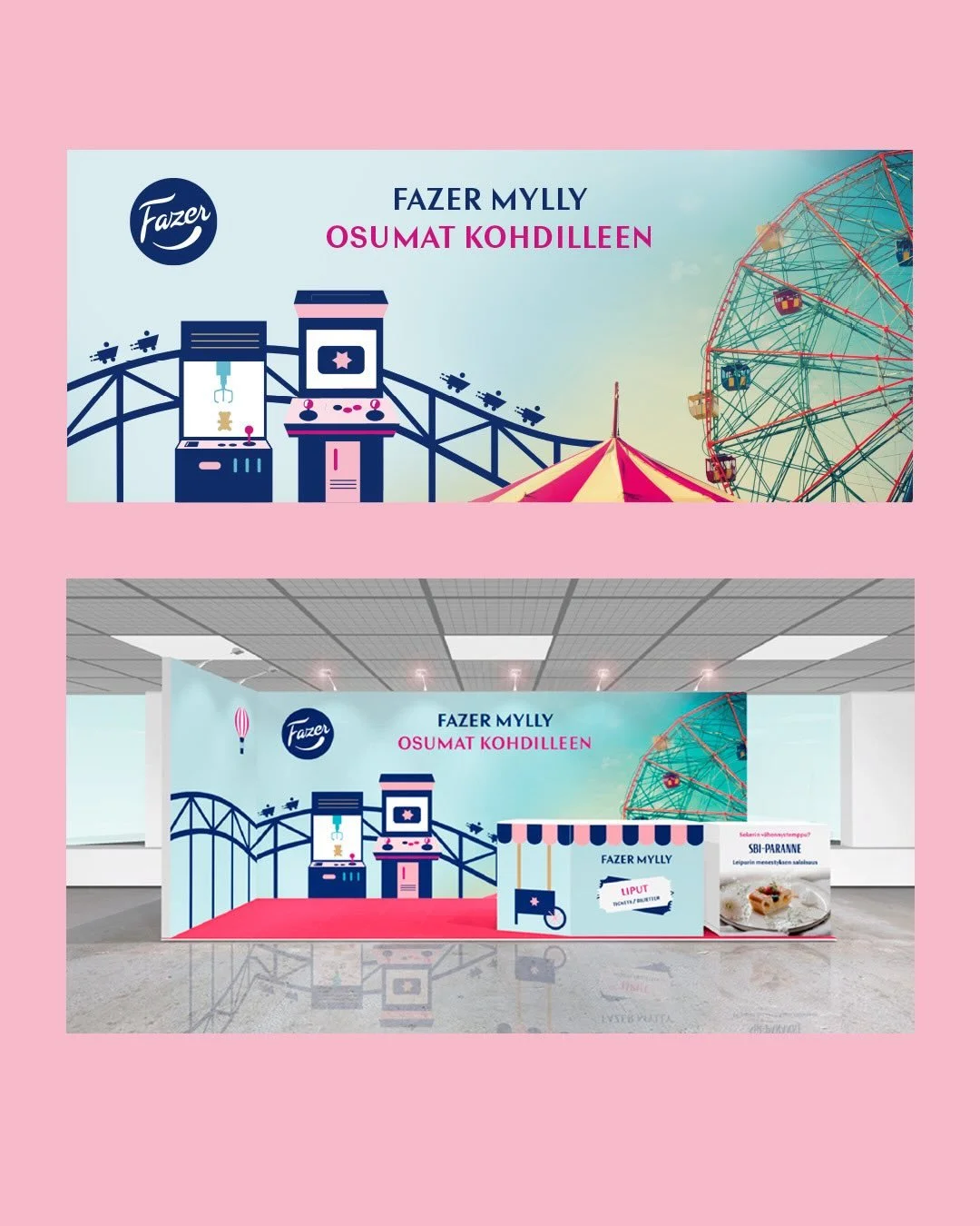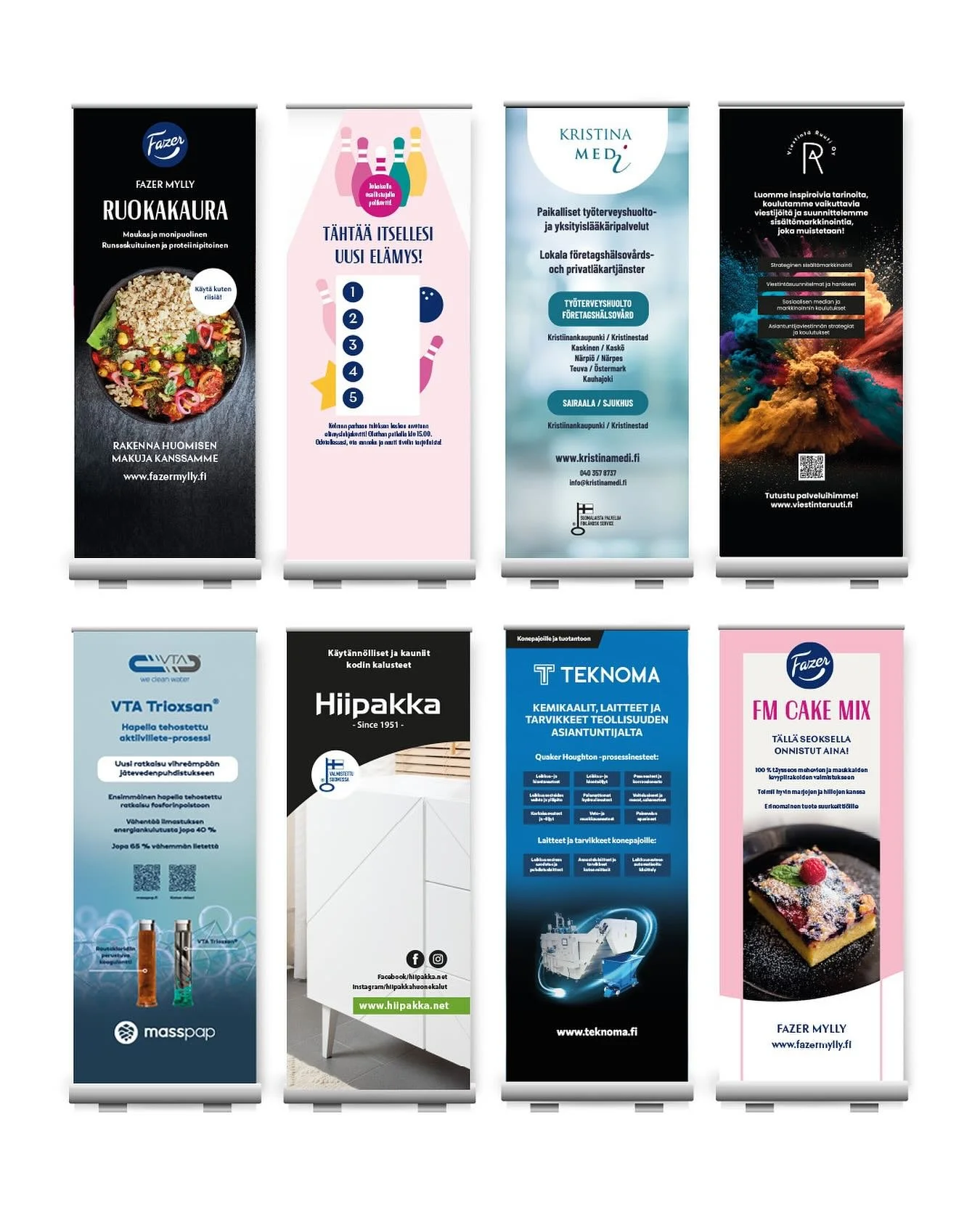 Brändin mukaiset messuseinät, infotiskit, rollupit, beachflagit, banderollit ja muut messuille ja muihin tapahtumiin tarvittavat aineistot.